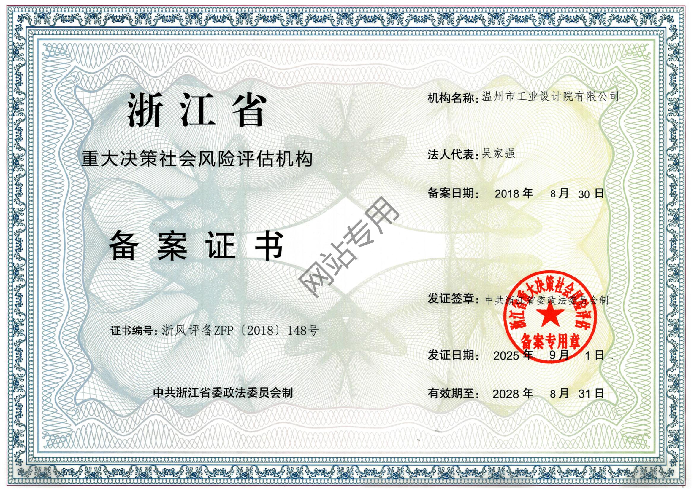 浙江省社會(huì)穩(wěn)定風(fēng)險(xiǎn)評(píng)估機(jī)構(gòu)備案證書(shū)