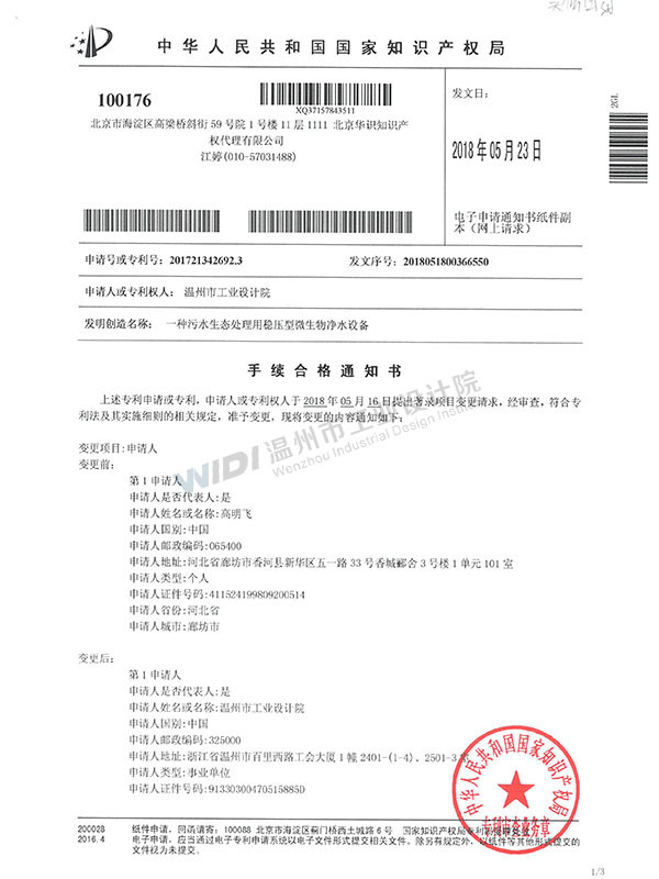 一種污水生態(tài)處理用穩(wěn)壓型微生物凈水設備手續(xù)合格通知書 (1)