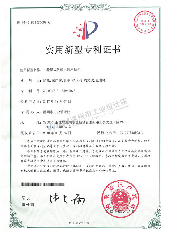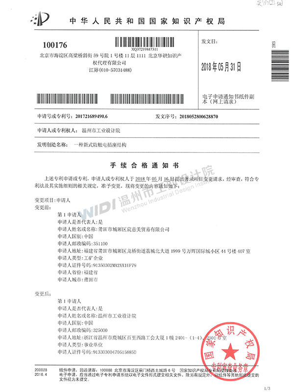 一種新式防觸電插座結構手續(xù)合格通知書 (1)