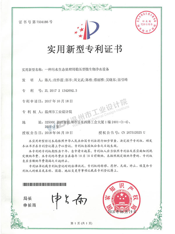 一種污水生態(tài)處理用穩(wěn)壓型微生物凈水設備證書