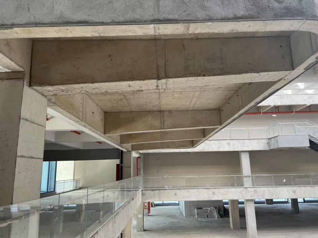 技術(shù)創(chuàng)新:通過(guò)對(duì)撓度和裂縫進(jìn)行控制,達(dá)到砼框架結(jié)構(gòu)6米大懸挑的要求;采用寬扁梁以及給排水管道穿梁的做法解決要求最大凈空的要求;中庭采用24米大跨度井字梁結(jié)構(gòu)。